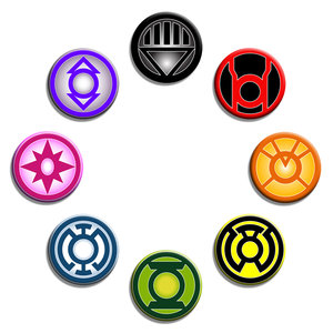 Bare with me here. Green represents Willpower and that means that you need to have a certain amount of willpower to use the ring. So lets see the colors: Yellow is Fear, Orange is Avarice (greed), Blue is Hope, Red is Rage, Violet is Love, Indigo is Compassion, and Black is Death. So what I find interesting is the different dynamics of all this. Each color has a ring and each ring has a symbol. What struck me the most about these symbols was love and compassion, which are close in colors. Violet, which is love, is a star with a circle in the middle, which represents the outward feeling of love. Compassion is similar, the indigo symbol is a circle in the middle with two triangles pointing outwardly (both up and down) which represents charity and concern for other people.