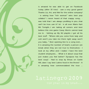I also know that I will be more aggressive with my life. I will get back to the running that I so fell in love with over the summer. I need to find that job so I can move out of Syracuse. My upcoming trip to the Dominican Republic is going to be something that will effect me. I know that there will a reconnect with family that I am eagerly awaiting. I am anticipating a rough year and I am willing to roll with it.