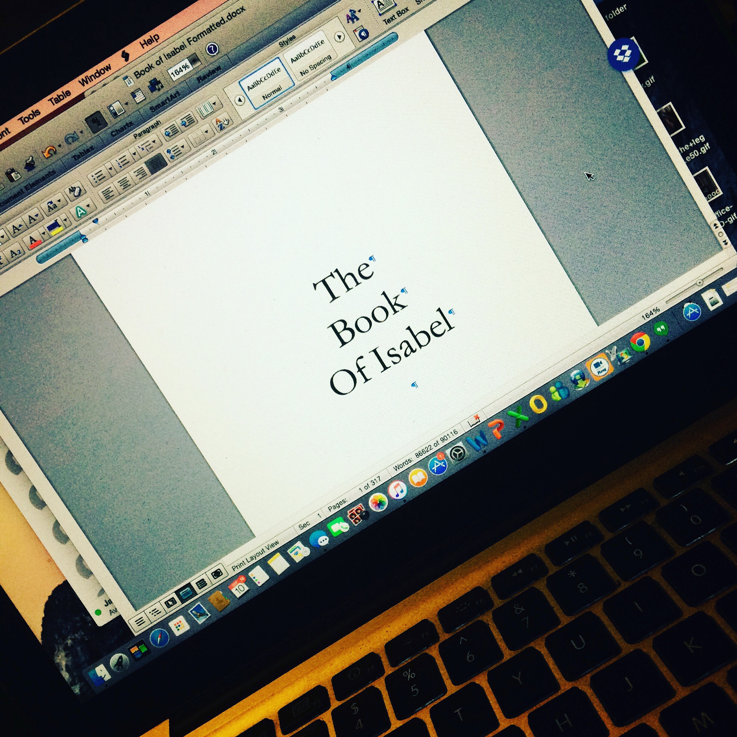 Anyway, the real work now begins with editing. I want to take my time and work with several people on this. I’m determined not to make the same mistakes I did with Hanging Upside Down. I anticipate a few more test readers and some proofers to finalize the book edits.