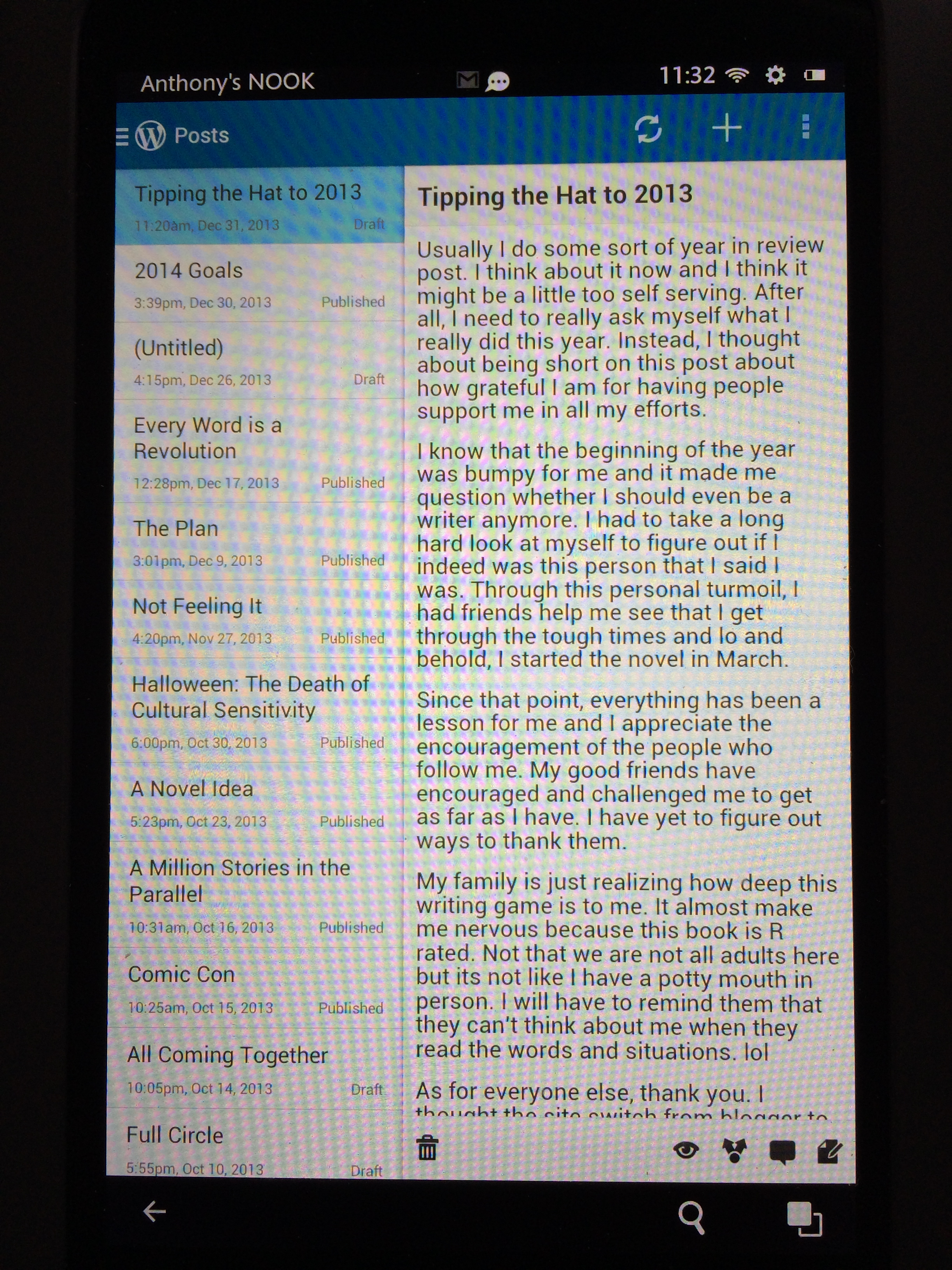 So now I am here. This looks cleaner. It feels smoother. I think that if I am going to still be about my writing, I need (you) the reader to be able to see the words crisply. No more fancy fonts in green. This is just as much about my relationship with those who choose to follow me. I am hoping all goes well here and I will say that the changes you see on this page will continue as I continue to grow. 2013 is here and expect big things to happen.